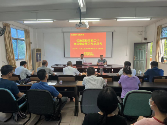 6月7日下午,广东工业大学帮扶队队长刘怡军在后勤管理处五楼会议室为我处全体党员上主题教育专题党课。处领导、各科科长、各中心正副主任、各食堂主管参加听党课,会议由欧就生处长主持。