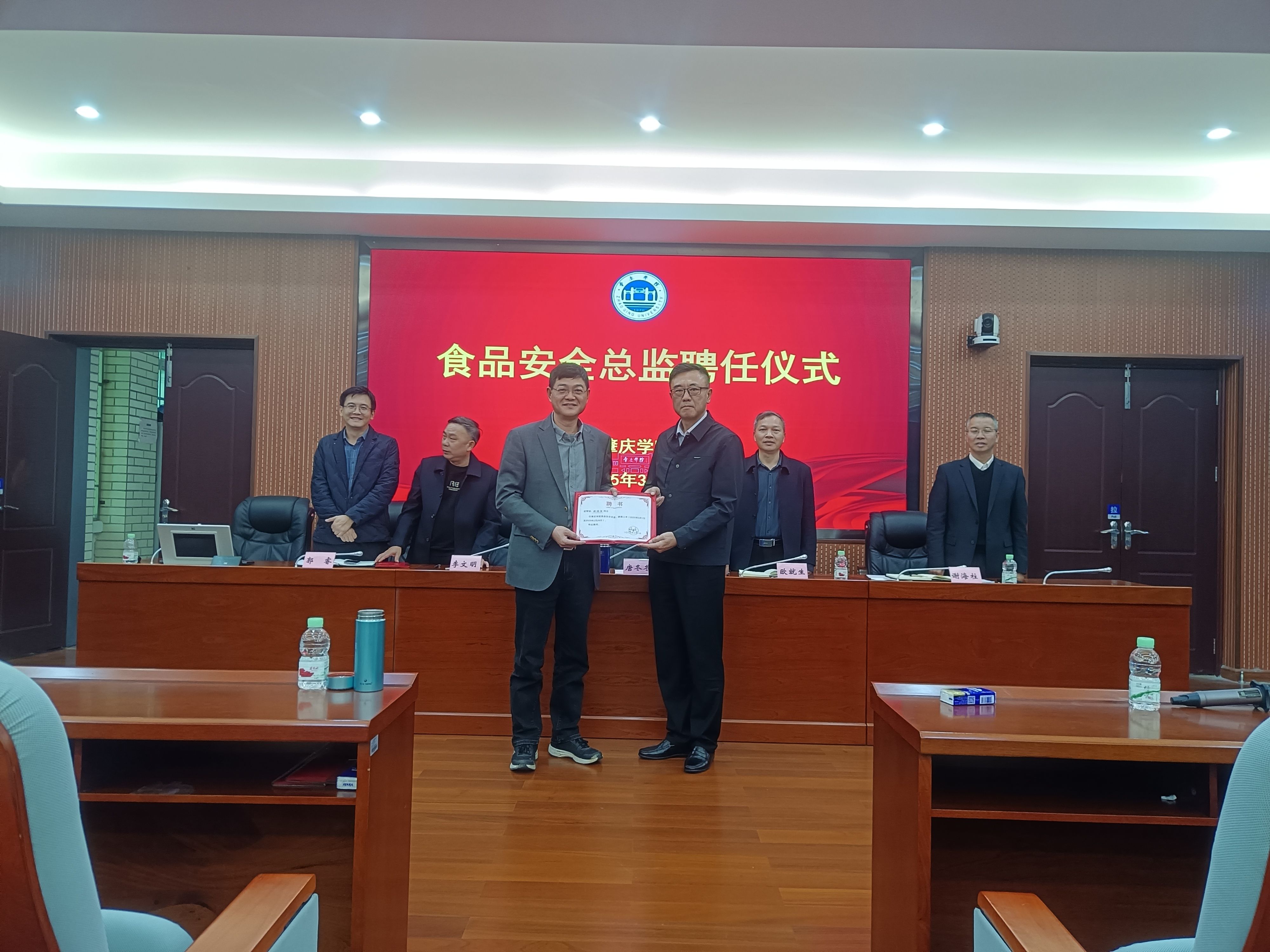 工作调度会后,还举行了新一任食品安全总监聘任仪式,唐冬冬副校长为新任食品安全总监刘济任同志颁发了聘任证书。
