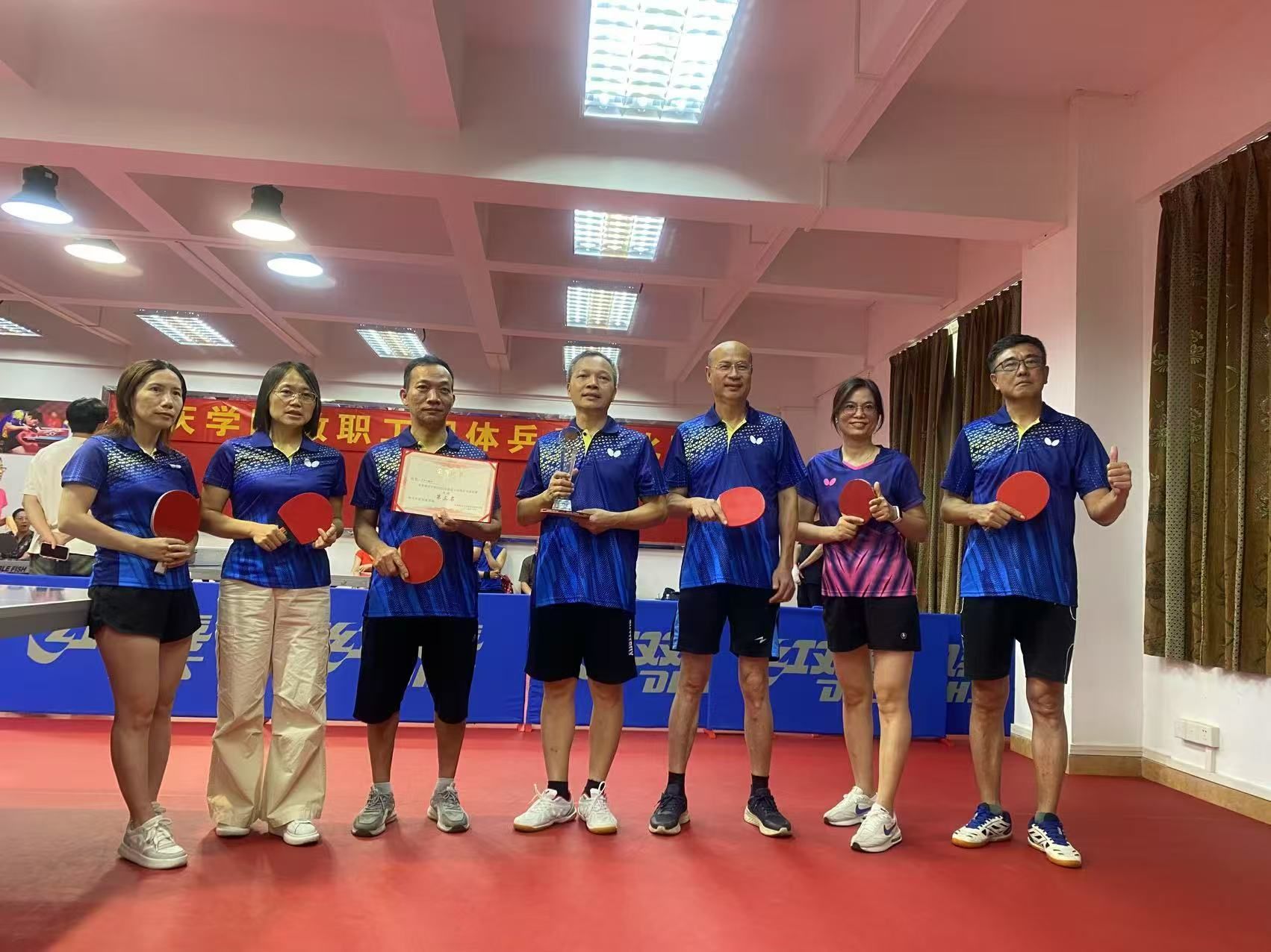 2025年6月24日下午,我校2025年教职工团体乒乓球比赛在教工之家圆满收官。总务后勤部乒乓球队全体队员团结协助,稳定发挥,奋力拼搏,荣获教职工团体乒乓球比赛季军。希望全体队员继续发挥球场上不怕苦、不怕累,敢于拼搏的作风,带动全体后勤员工,积极投身后勤服务工作中去,为学校高质量发展提供强有力的后勤服务保障。