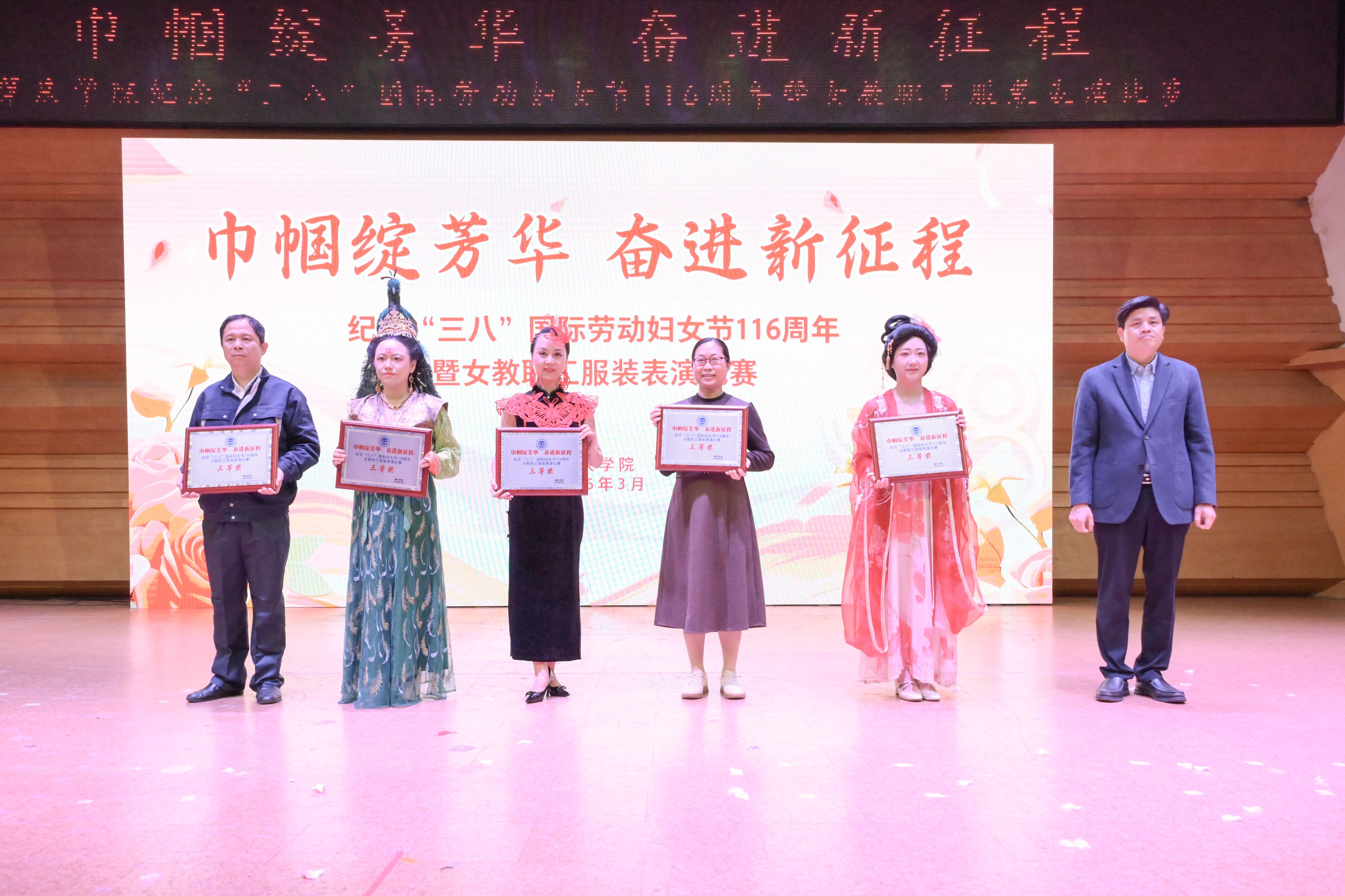 2026年3月11日,为庆祝第116个“三八”国际劳动妇女节,校工会在学校陈熹音乐厅举办纪念“三八”国际劳动妇女节116周年暨女教职工服装表演比赛。由总务后勤部分工会精心挑选的8位女职工代表在十八支队伍中脱颖而出,最终斩获三等奖。